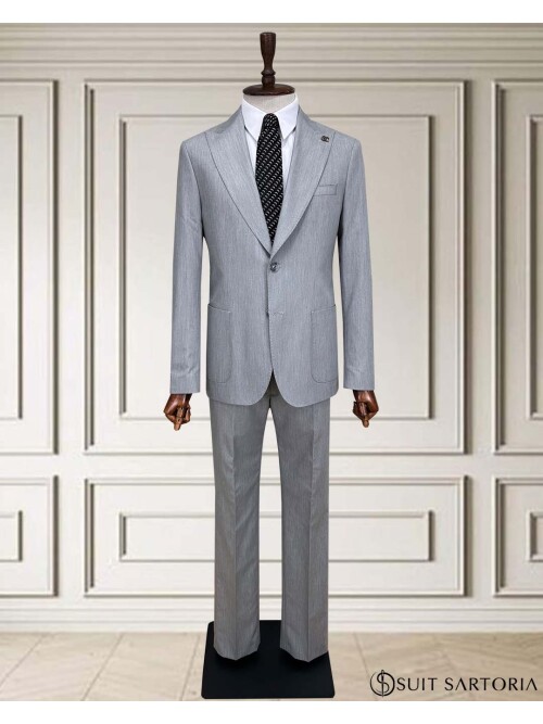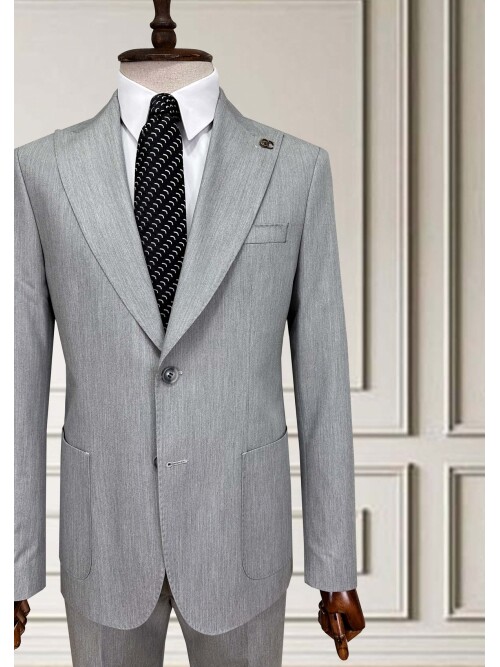 A light gray suit is the perfect choice for men seeking an elegant and stylish look. The peaked lapel design creates a modern and eye-catching appeal, while patch pocket details blend classic touches with a contemporary edge. The double-button closure adds a traditional sense of sophistication, while the 6-drop cut ensures a perfectly tailored fit. A double vent provides both style and comfort, enhancing freedom of movement and allowing the wearer to move with ease.