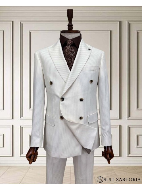 Beyaz, çizgili kruvaze takım elbise, şıklığı ve özgün tasarımıyla dikkat çeker. Sivri yaka detayı, modern ve keskin bir görünüm sağlarken; kapaklı cepler hem şık hem de işlevseldir. 6 düğmeli kruvaze kesim, takım elbisenin karakteristik özelliğini vurgular ve vücuda mükemmel oturur. Çift yırtmaçlı arka tasarım ise hareket özgürlüğü sunarak konforu artırır. Toptan erkek kruvaze takım elbise satışı yapan firmalar için bu beyaz çizgili model, özel günlerde ve iş hayatında tercih edilebilecek zarif ve dikkat çekici bir seçenektir. Koleksiyonunuza prestijli, klasik ve modern bir parça eklemek isteyen satıcılar için idealdir.