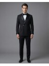 Redefining the style codes for the modern man, this black double-breasted tuxedo brings an innovative perspective to classic formal wear. The design features a sharp peak lapel that projects a dynamic and authoritative stance, while the iconic single-button closure balances the weight of the double-breasted cut with minimal elegance. Flap pockets provide a functional yet sophisticated touch to the overall look. The internal fully lined construction ensures the jacket maintains its sharp form while promising superior comfort during day-long events. The double vent detail allows for maximum freedom of movement without compromising the sleek appearance of the modern cut. Crafted for those who wish to stand out at weddings, engagements, or gala nights, this tuxedo set elevates your style with its premium fabric texture.