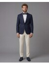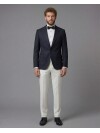 Şıklığın en asil halini, konforla buluşturan bu özel smokin takımı, her detayıyla titiz bir işçiliğin ürünüdür. Klasik bir temele sahip olan siyah ceket, modern sivri yaka (peak lapel) formuyla dinamik ve otoriter bir duruş kazanır. Ceketin kalbinde yer alan tek düğme kapama, minimalist ve pürüzsüz bir silüet oluştururken, klasik kapaklı cep detayları işlevselliği şıklıkla harmanlar. Giydiğiniz her anı konforlu kılmak adına tasarlanan bu takım, comfort fit kalıbı sayesinde vücudu sıkmadan sarar ve modern, rahat bir oturum sağlar. İçi tam astar ile kaplanmış olan ceket, formunu uzun süre korurken, arka kısımda yer alan çift yırtmaç detayı hareket halindeyken size maksimum özgürlük tanır. Takımın alt parçasını oluşturan kusursuz kesimli beyaz pantolon, siyah ceketle mükemmel bir tezat oluşturarak sizi sıradanlıktan uzaklaştırır. Bu smokin, hem klasik hem de modern unsurları barındıran yapısıyla, düğünler, balolar ve tüm resmi galalar için ideal, zamansız bir seçenektir.